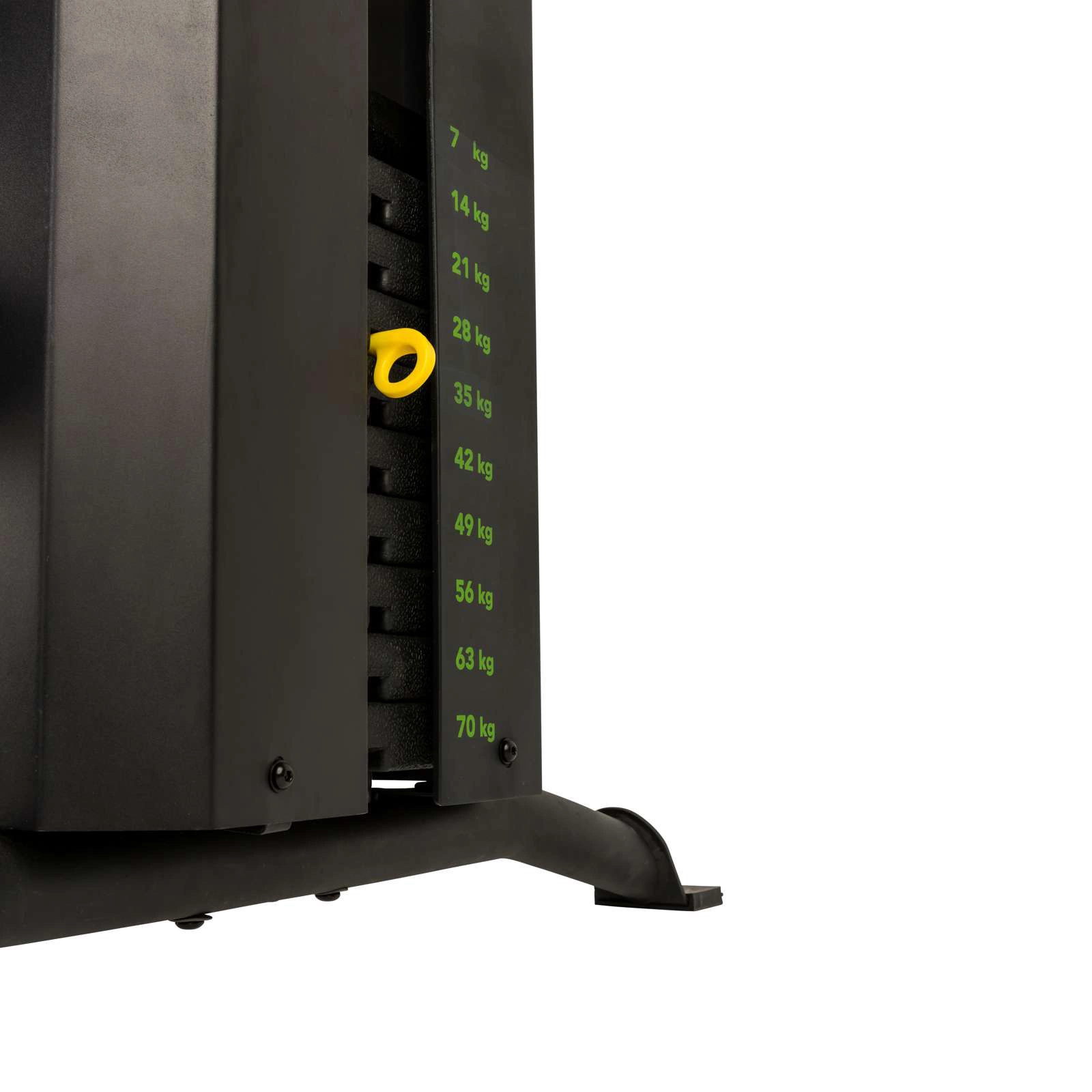 Urządzenie wyposażone jest w stos obciążeń składający się z 10 płyt, z których każda waży 7 kg (łącznie 70 kg). Taki system umożliwia płynną regulację intensywności treningu – od lekkiego obciążenia dla początkujących, po wymagające ustawienia dla zaawansowanych użytkowników. Obciążenia można szybko zmieniać, co pozwala na dynamiczne przechodzenie między ćwiczeniami bez przerywania rytmu treningu.