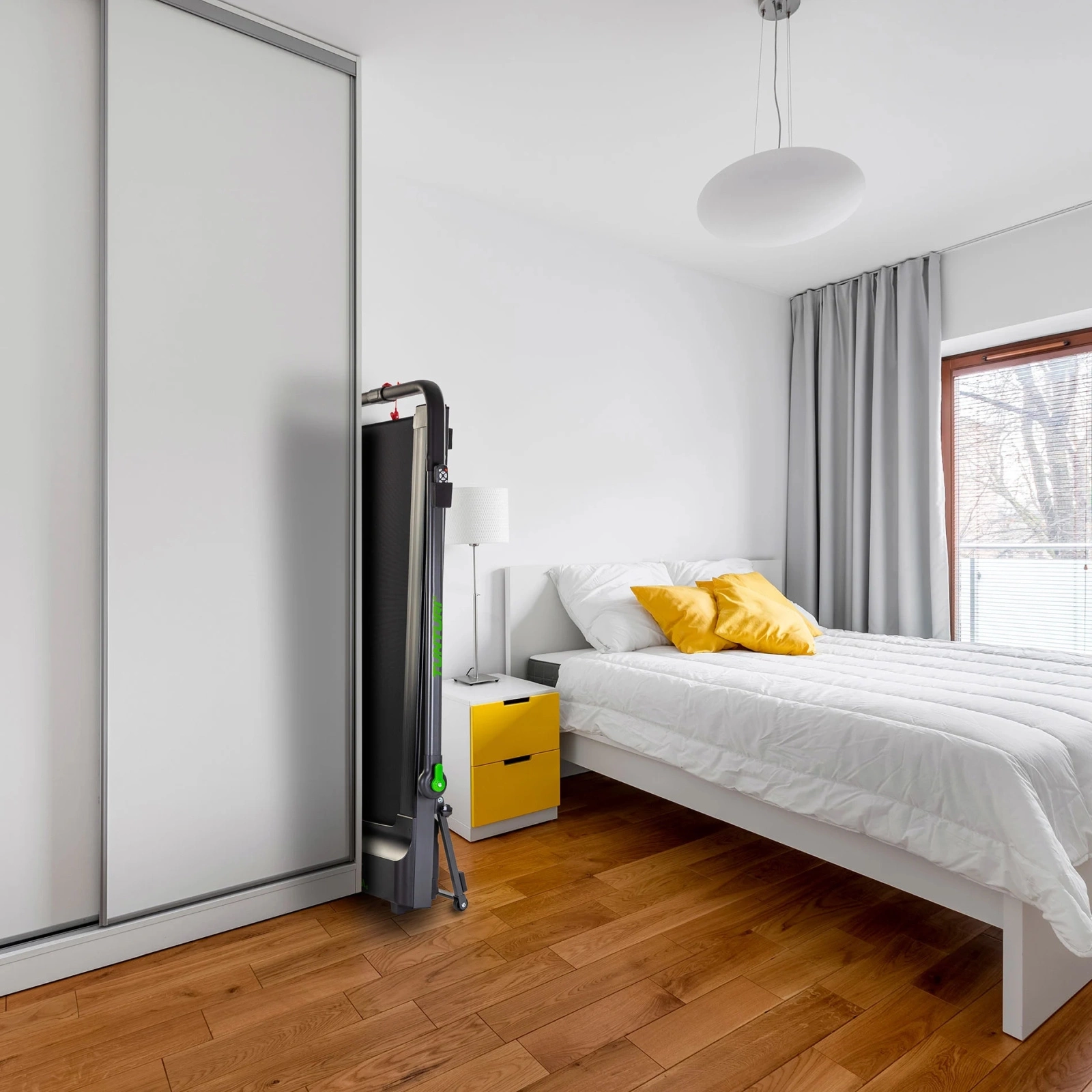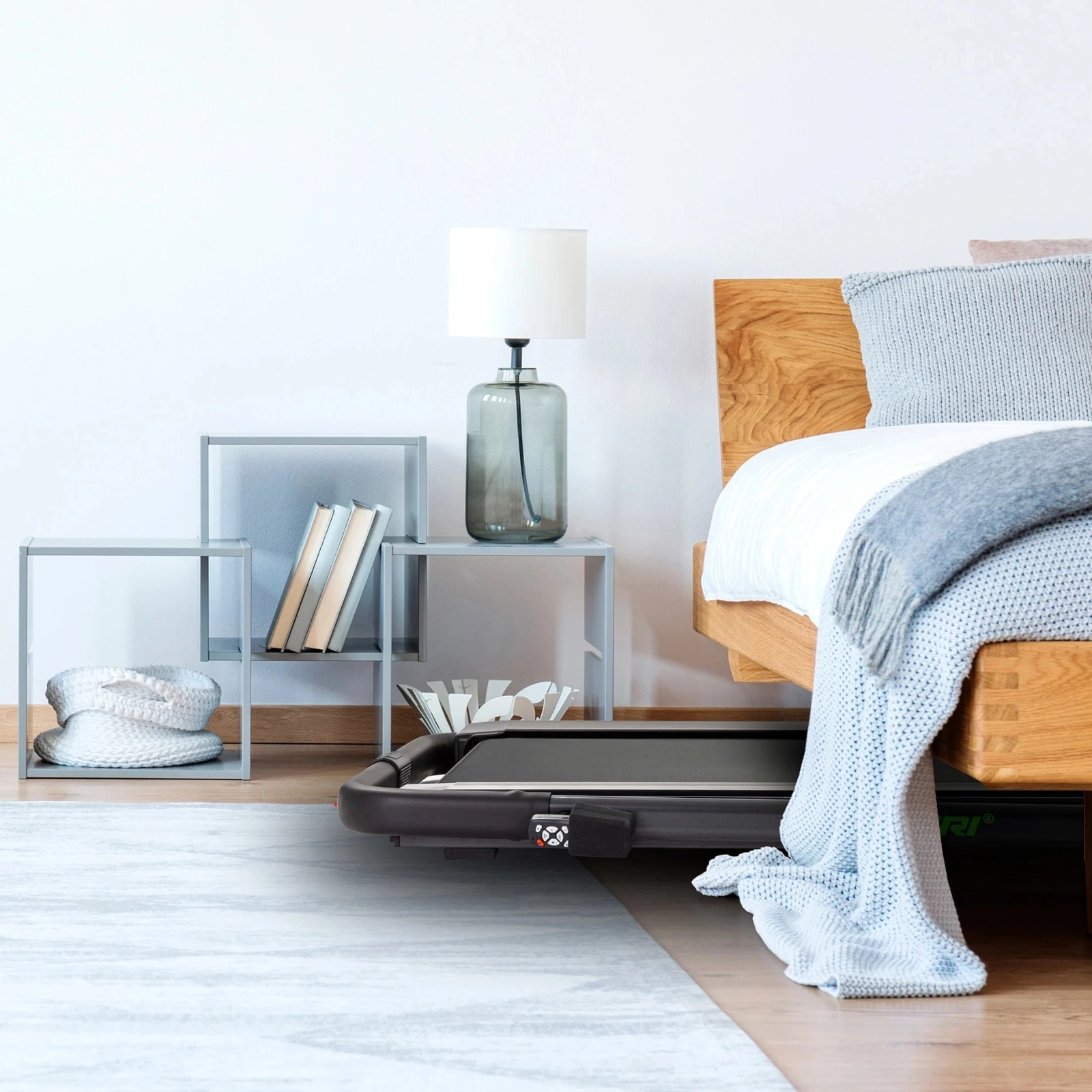 - Kompaktowa i składana konstrukcja: Bieżnia po złożeniu ma zaledwie 16 cm wysokości, co ułatwia jej przechowywanie pod łóżkiem lub w szafie.