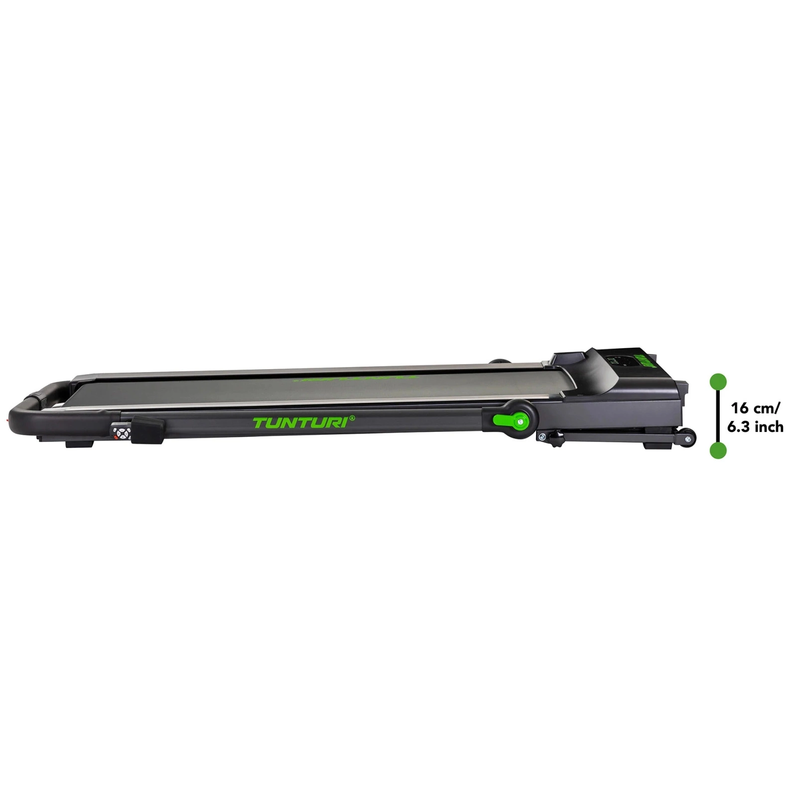 Walkingpad Tunturi Cardio Fit T10 wyróżnia się wyjątkowo kompaktową konstrukcją, która sprawia, że jest idealnym rozwiązaniem do mieszkań oraz mniejszych przestrzeni. Po złożeniu jej wysokość wynosi zaledwie 16 cm, co umożliwia łatwe schowanie bieżni pod łóżkiem, w szafie lub za drzwiami, nie zajmując cennego miejsca w domu.
