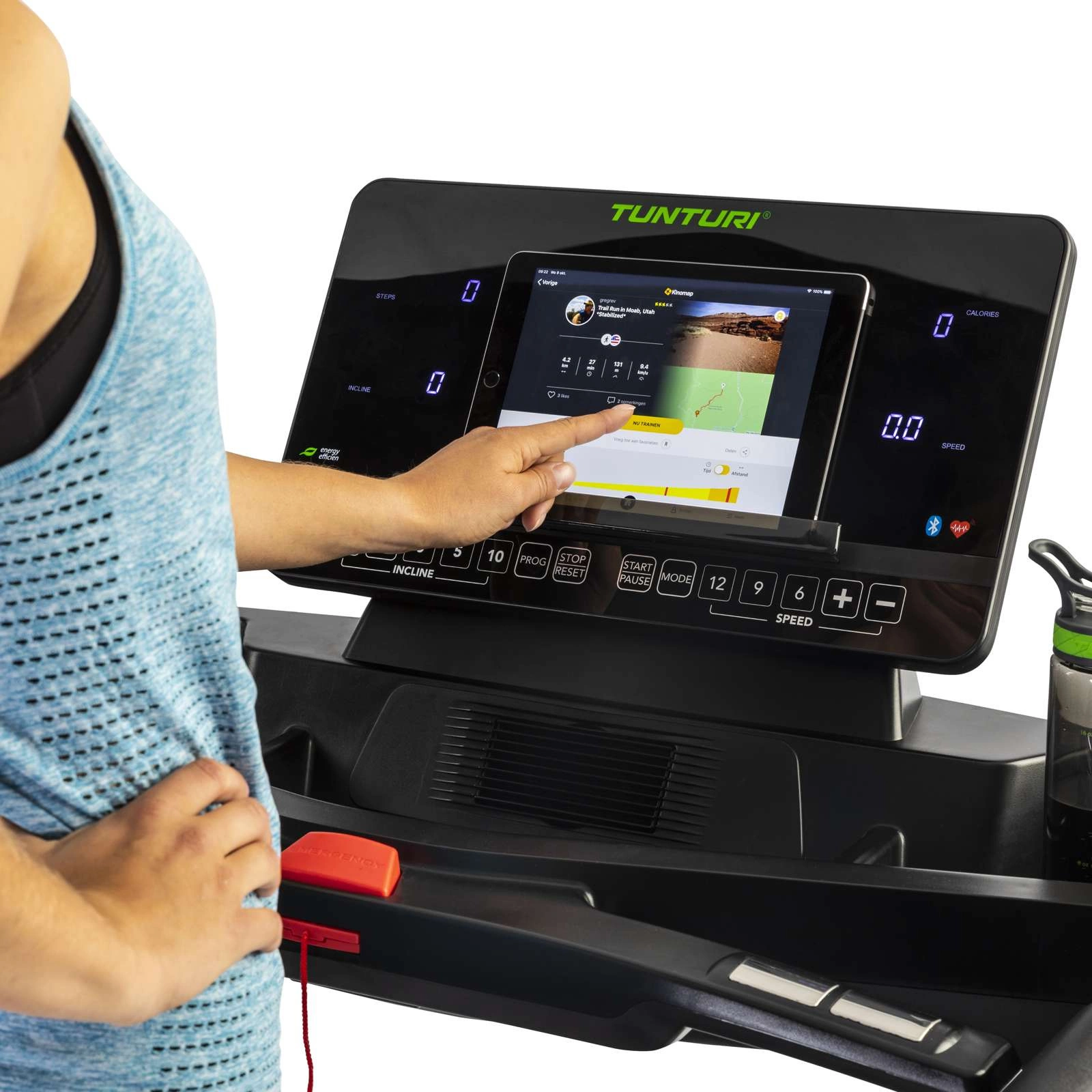 - Kompatybilność z aplikacjami – Możliwość połączenia z Tunturi Routes i Zwift umożliwia interaktywne treningi z realistycznym dopasowaniem nachylenia bieżni do wirtualnych tras.