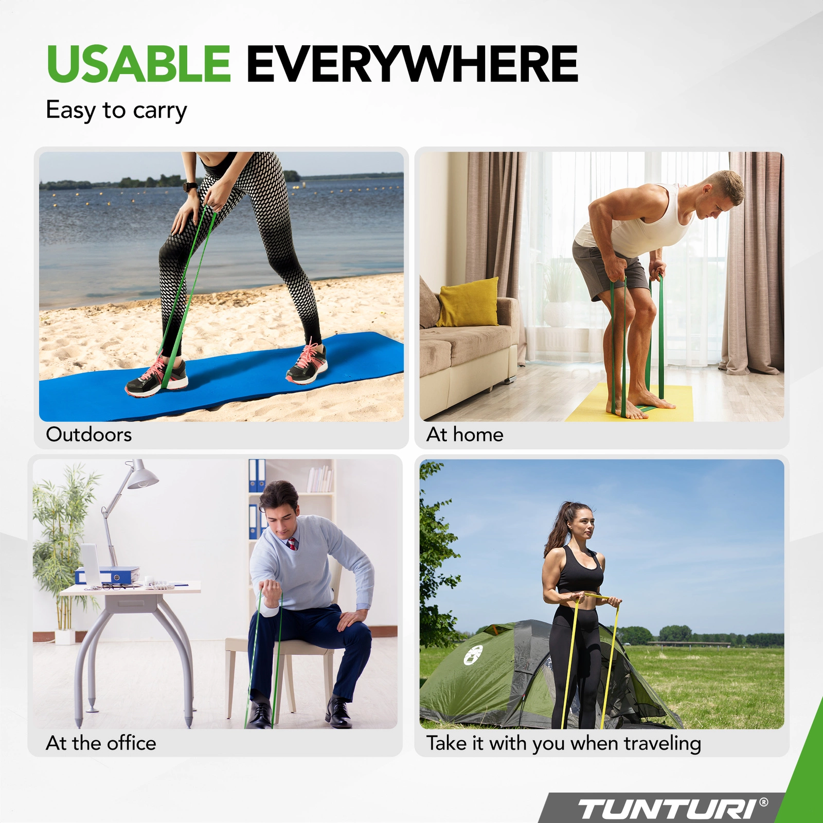 Dzięki kompaktowej i lekkiej konstrukcji, guma oporowa Tunturi to idealne akcesorium treningowe, które możesz zabrać ze sobą wszędzie: