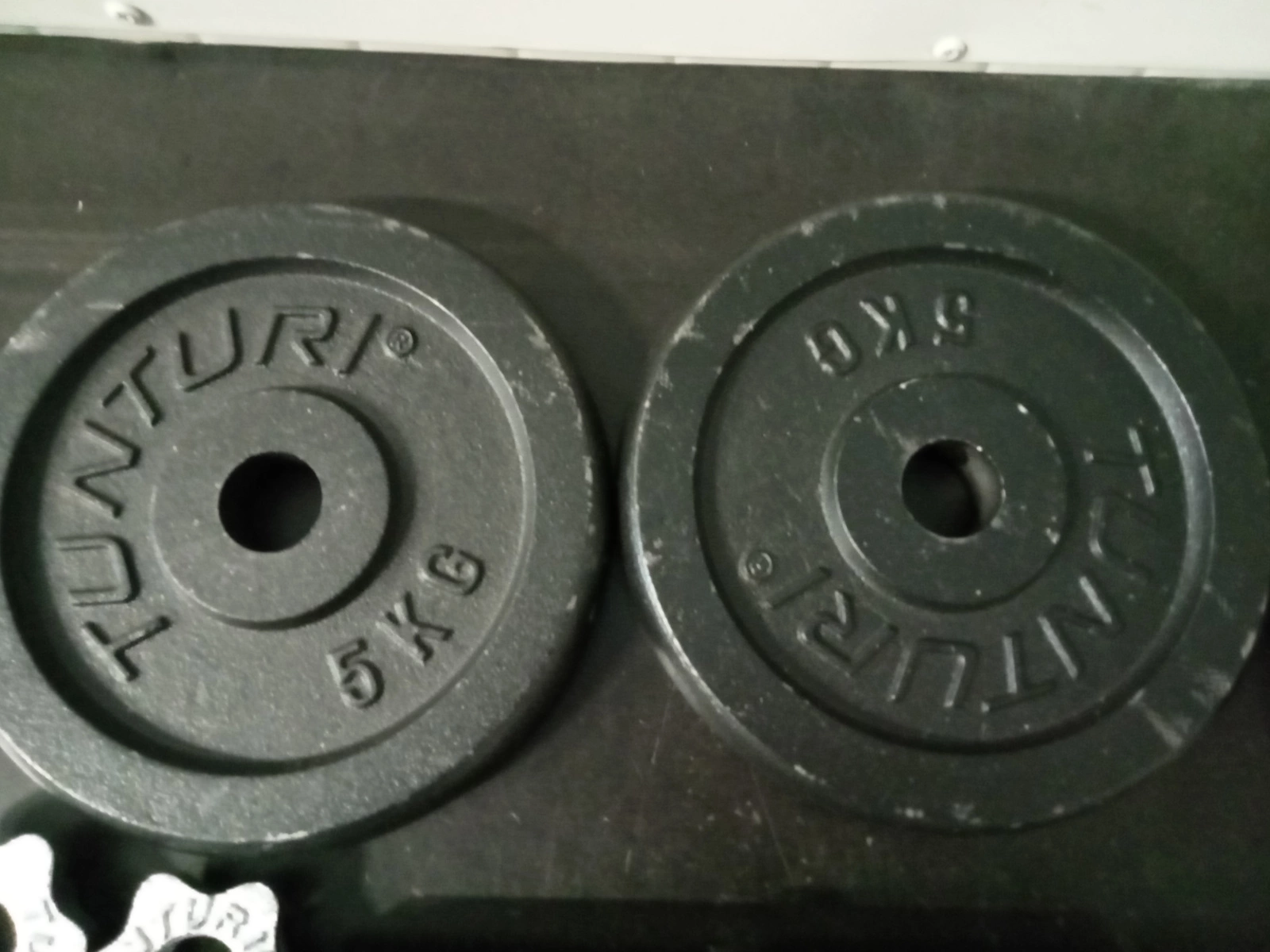 - 6 krążków na hantle: 2x5kg | 2x2,5 kg | 2x1,25 kg