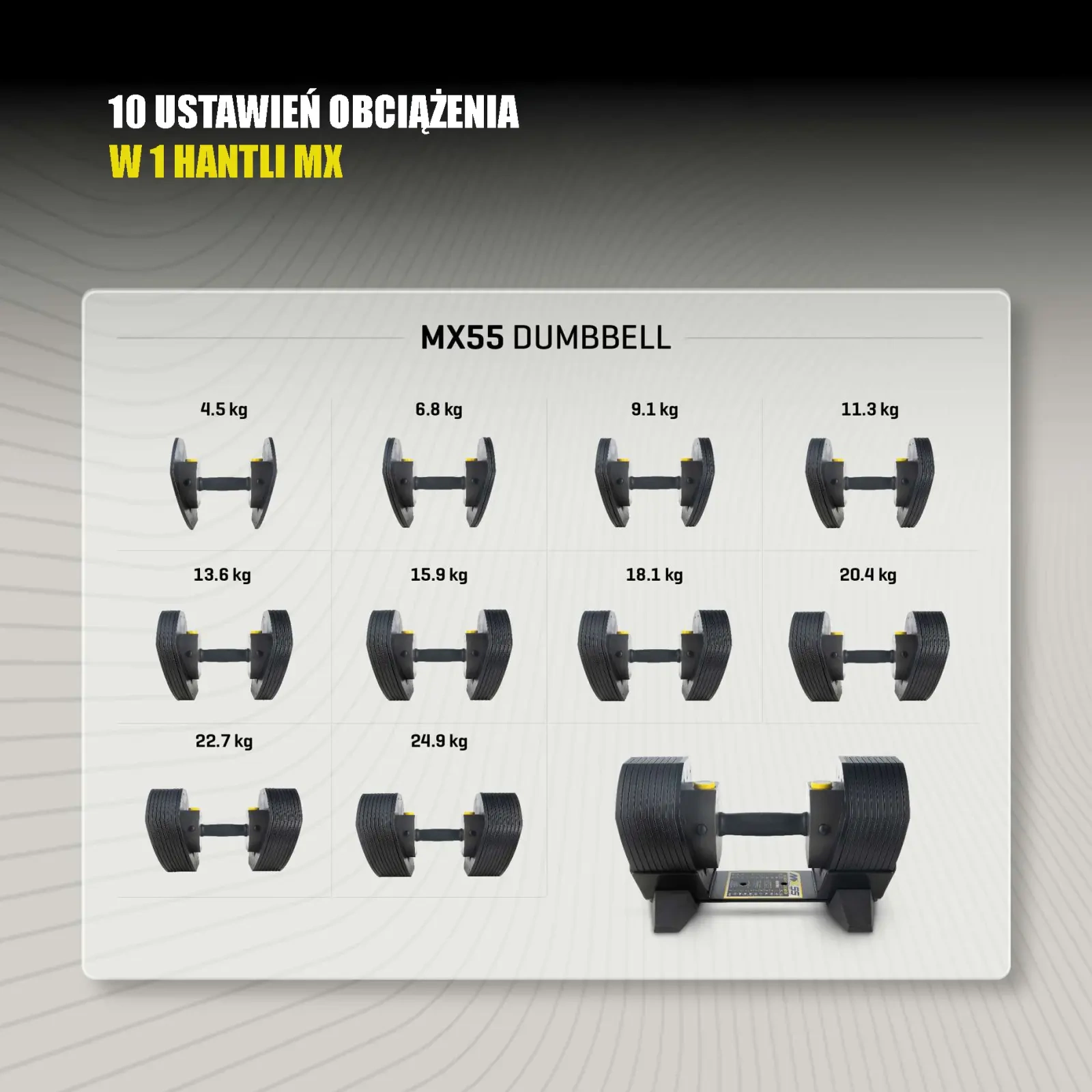 Hantle regulowane MX SELECT MX55 to idealny wybór dla osób, które lubią ćwiczyć ze zmiennym obciążeniem, ale zależy im na oszczędności miejsca w domowej siłowni. To najpopularniejsze rozwiązanie umożliwiające błyskawiczny, komfortowy i bezpieczny dobór ciężaru, odpowiedni dla trenującego o każdym stopniu zaawansowania trening z oporem.