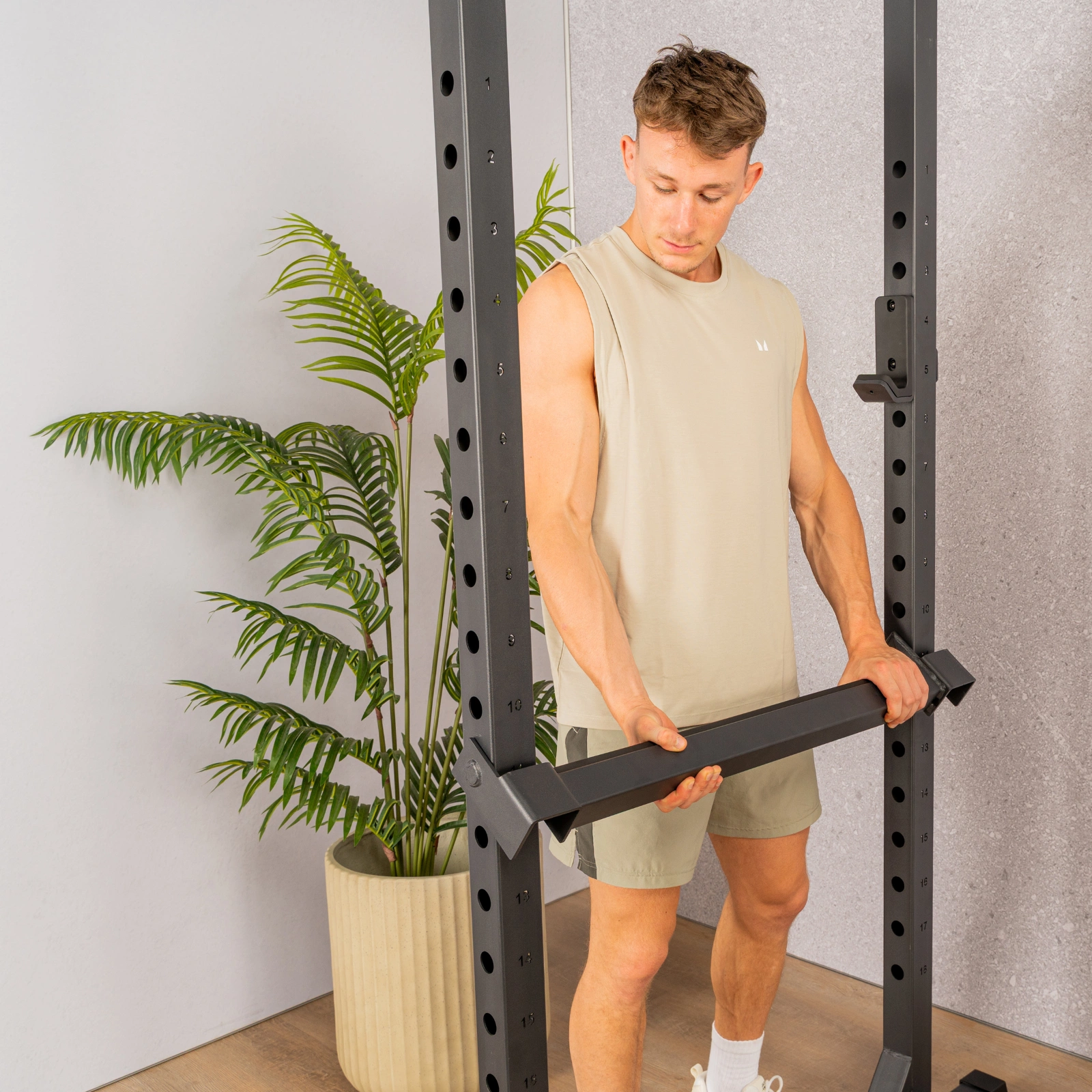 Dzięki 18-stopniowej regulacji J-Hooków i ram asekuracyjnych możesz precyzyjnie dopasować klatkę do rodzaju ćwiczeń. Specjalny hak do przechowywania sztangi pomaga utrzymać porządek w Twojej przestrzeni treningowej.Dodatkowe akcesoria - takie jak wyciąg górny czy dip bar, poszerzają możliwości treningowe, pozwalając tworzyć kompleksowe stanowisko do treningu siłowego.
