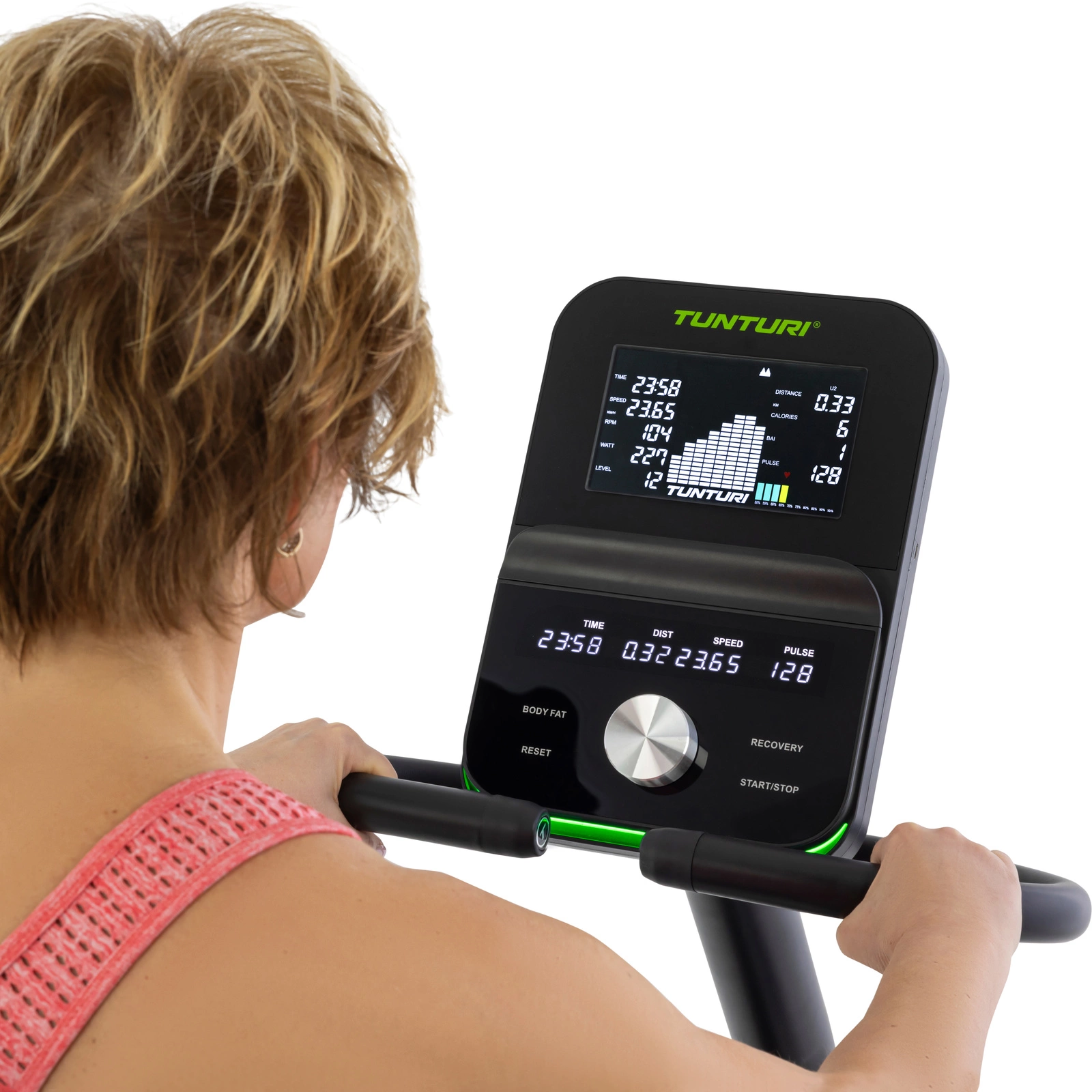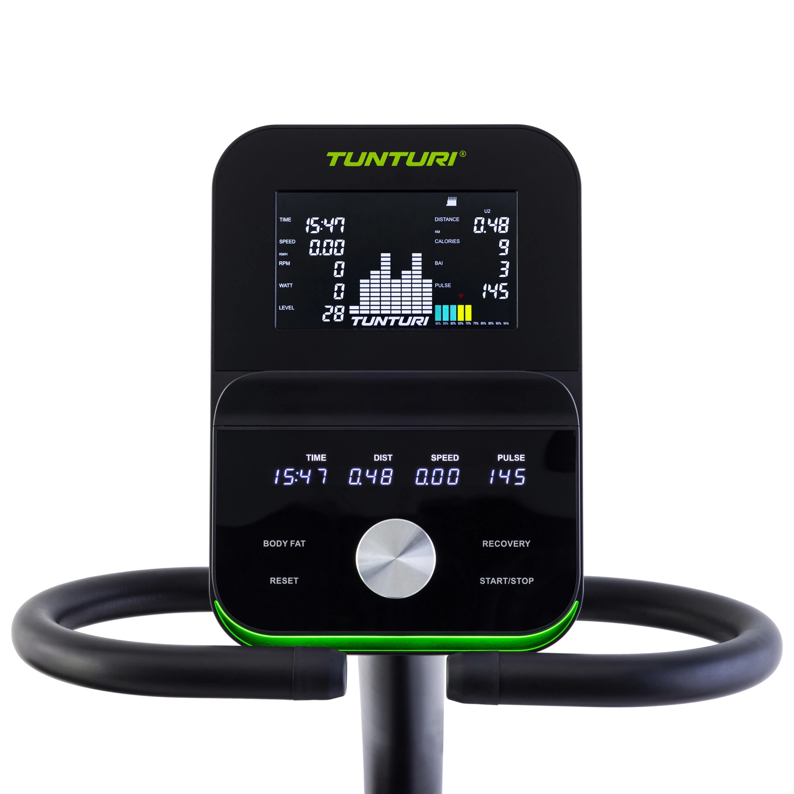 Na czytelnym ekranie monitora Bluetooth AI znajdziesz m.in. czas, dystans, spalone kalorie, prędkość, poziom oporu, tętno, kadencję (RPM), waty i profil treningowy. Dzięki aplikacji iConsole+ możesz tworzyć spersonalizowane plany treningowe w oparciu o dotychczasowe wyniki. Monitor można nachylić ręcznie, a wbudowany uchwyt na tablet pozwala oglądać filmy lub korzystać z aplikacji takich jak Tunturi Routes czy Zwift.