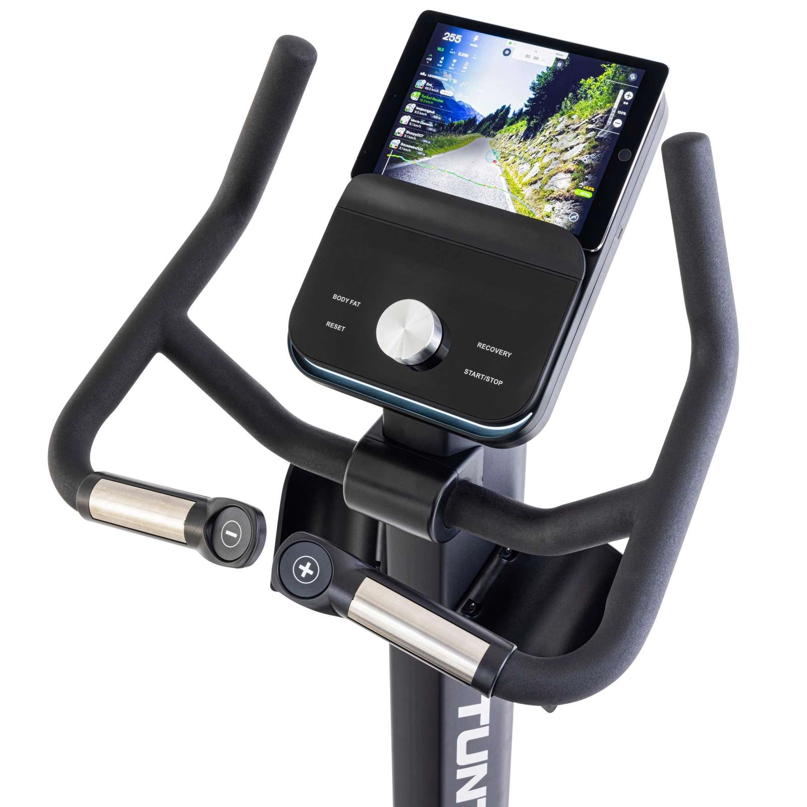 Tunturi Platinum UB20 Upright Bike umożliwia precyzyjne monitorowanie intensywności treningu dzięki wbudowanemu monitorowi Bluetooth AI. System wykorzystuje strefy tętna, które pozwalają na bieżąco śledzić, w jakiej strefie tętna się znajdujesz. Dzięki temu możesz dokładnie dopasować intensywność ćwiczeń do swojego poziomu kondycji i celów treningowych. Monitor wyświetla wszystkie kluczowe dane treningowe, takie jak czas, dystans, kalorie, opór, RPM oraz moc, co pomaga w efektywnym planowaniu postępów. Jeśli chcesz, możesz umieścić tablet w zintegrowanym uchwycie, aby równocześnie śledzić parametry treningowe i korzystać z aplikacji.