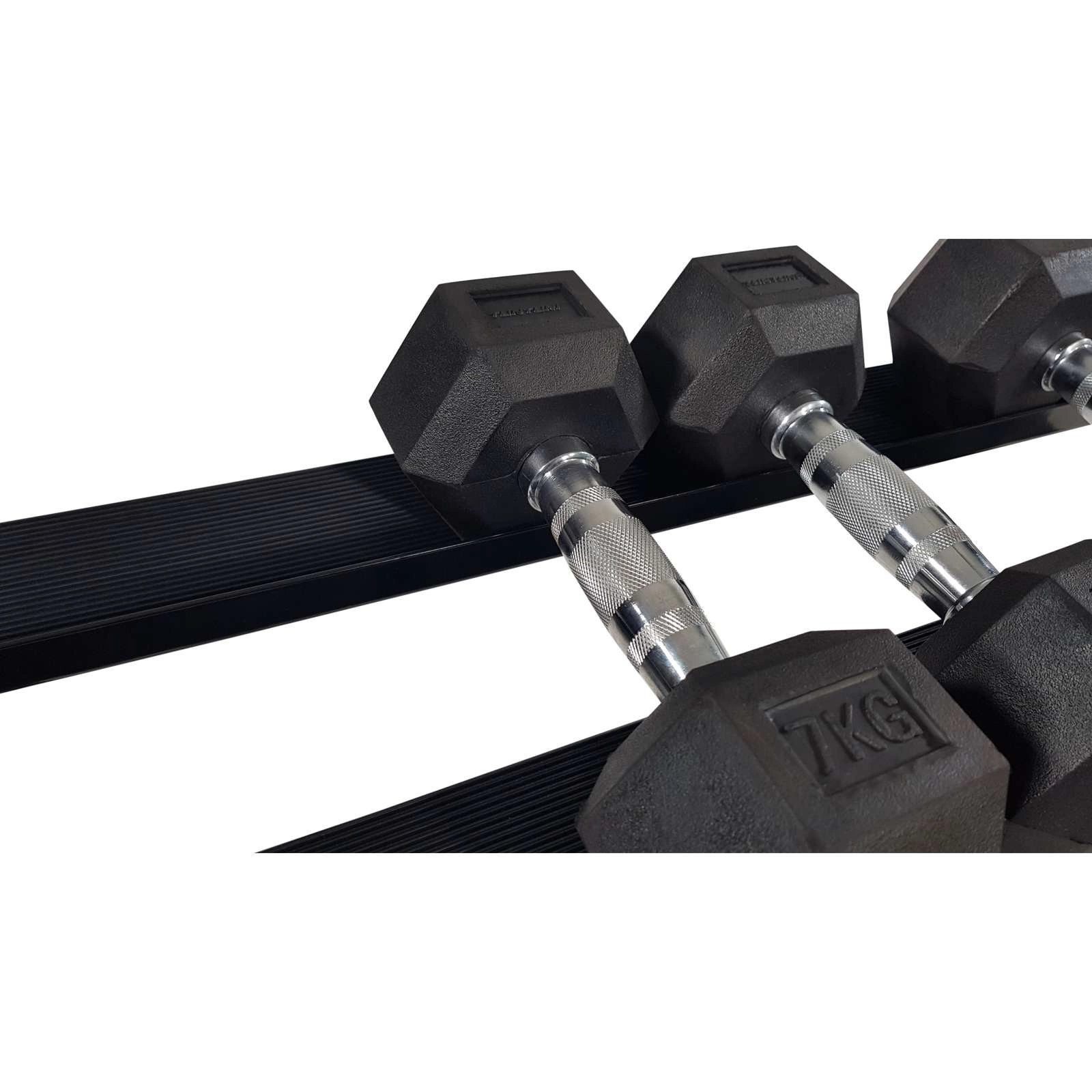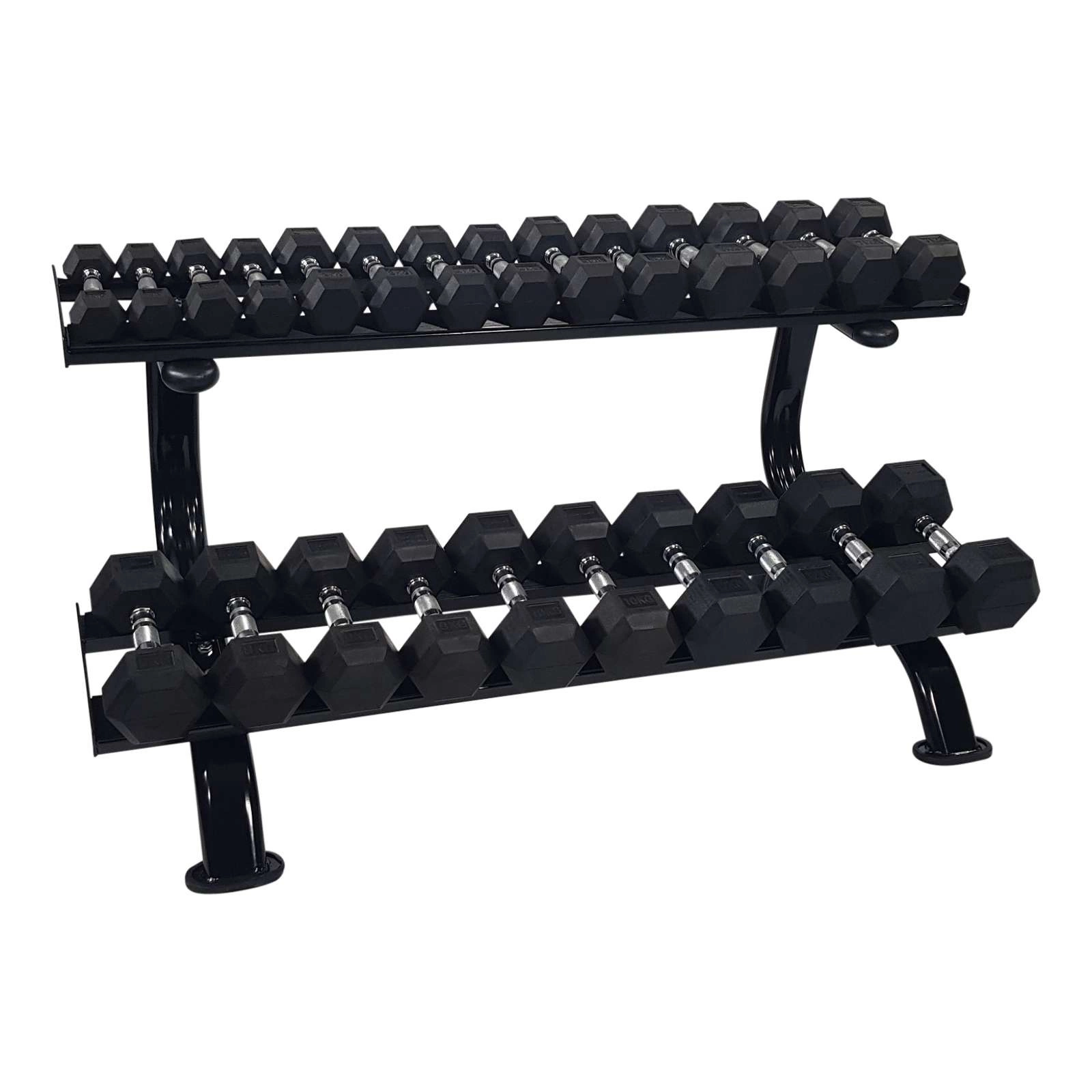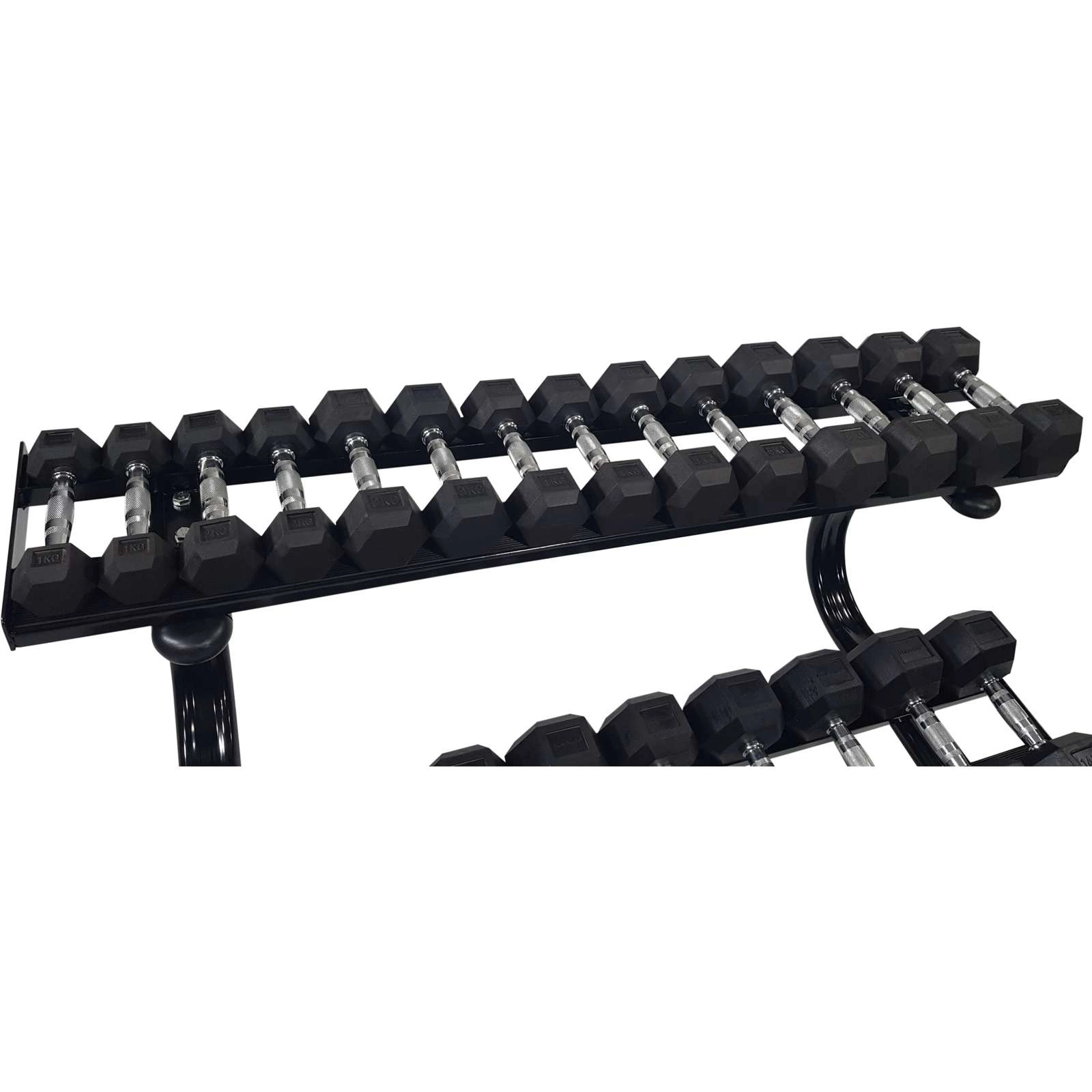 - Dwupoziomowa konstrukcja - Umożliwia przechowywanie hantli na dwóch poziomach, co pozwala na efektywne wykorzystanie przestrzeni i łatwy dostęp do sprzętu.
