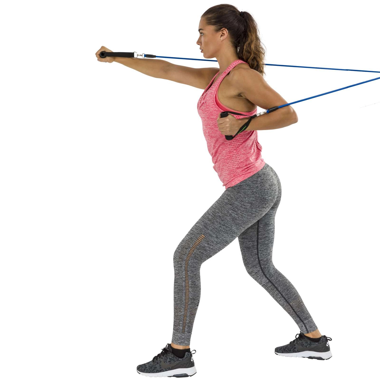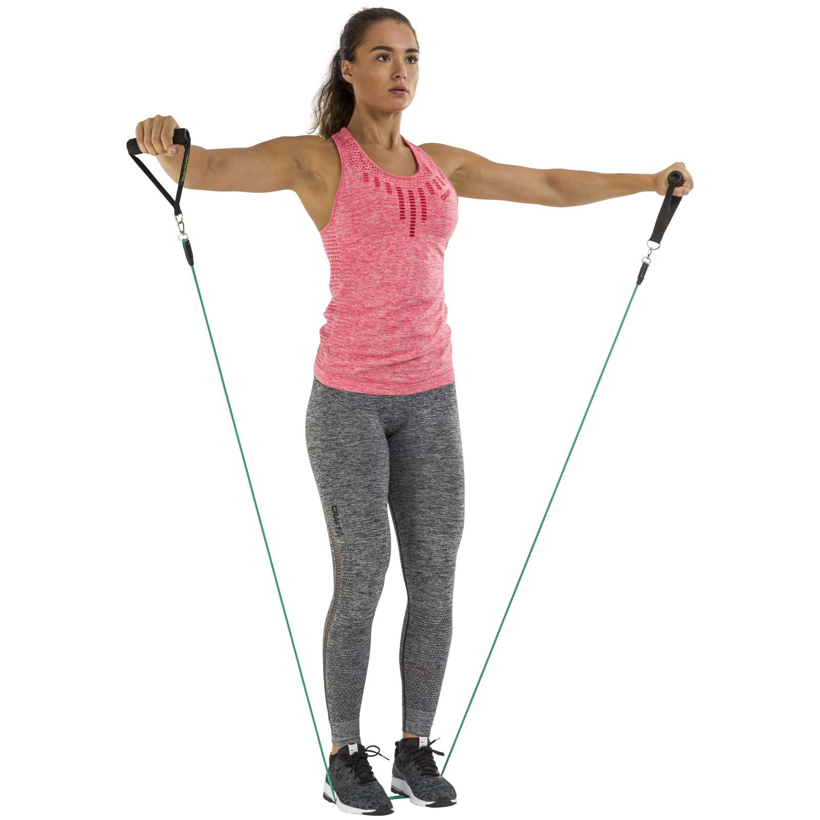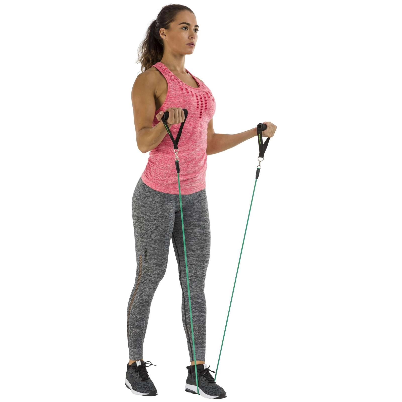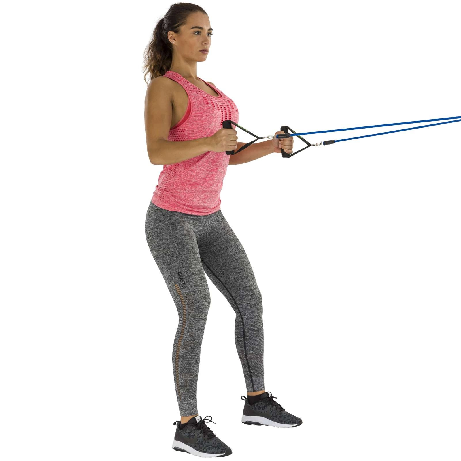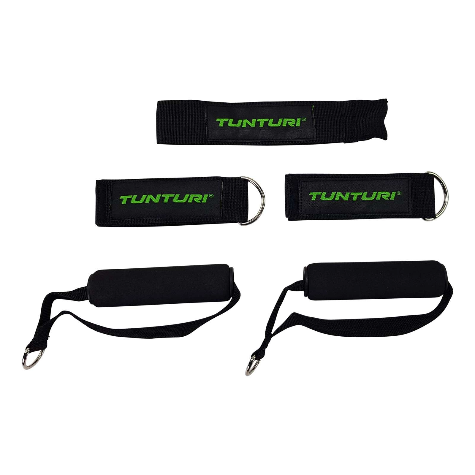 - 2 uchwyty do rąk, 2 opaski na kostki i uchwyt do drzwi – maksymalna różnorodność ćwiczeń.