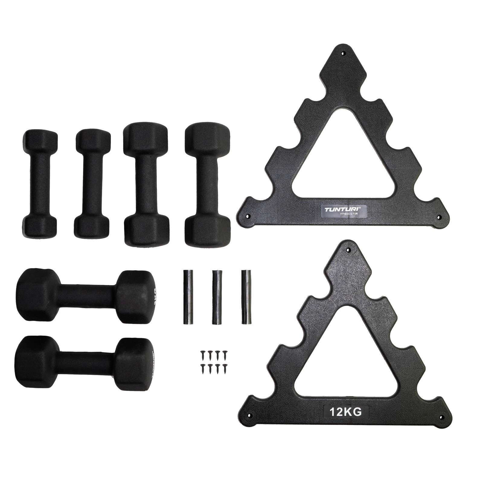 - Całkowita waga, łącznie ze stojakiem do przechowywania hantli: 12,3 kg.