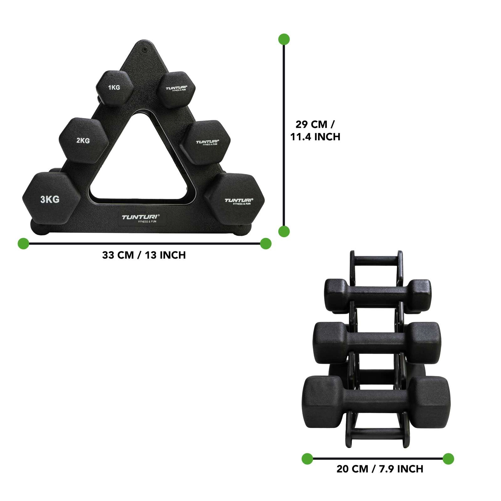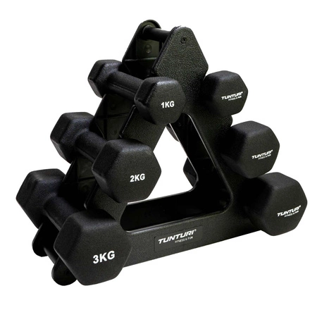 Zestaw składa się z 3 par hantli o różnych ciężarach (1kg, 2kg, 3kg) i jest wyposażony w stojak do przechowywania. Dzięki 6-kątnemu kształtowi hantle nie będą się toczyć, gdy leżą na podłodze.