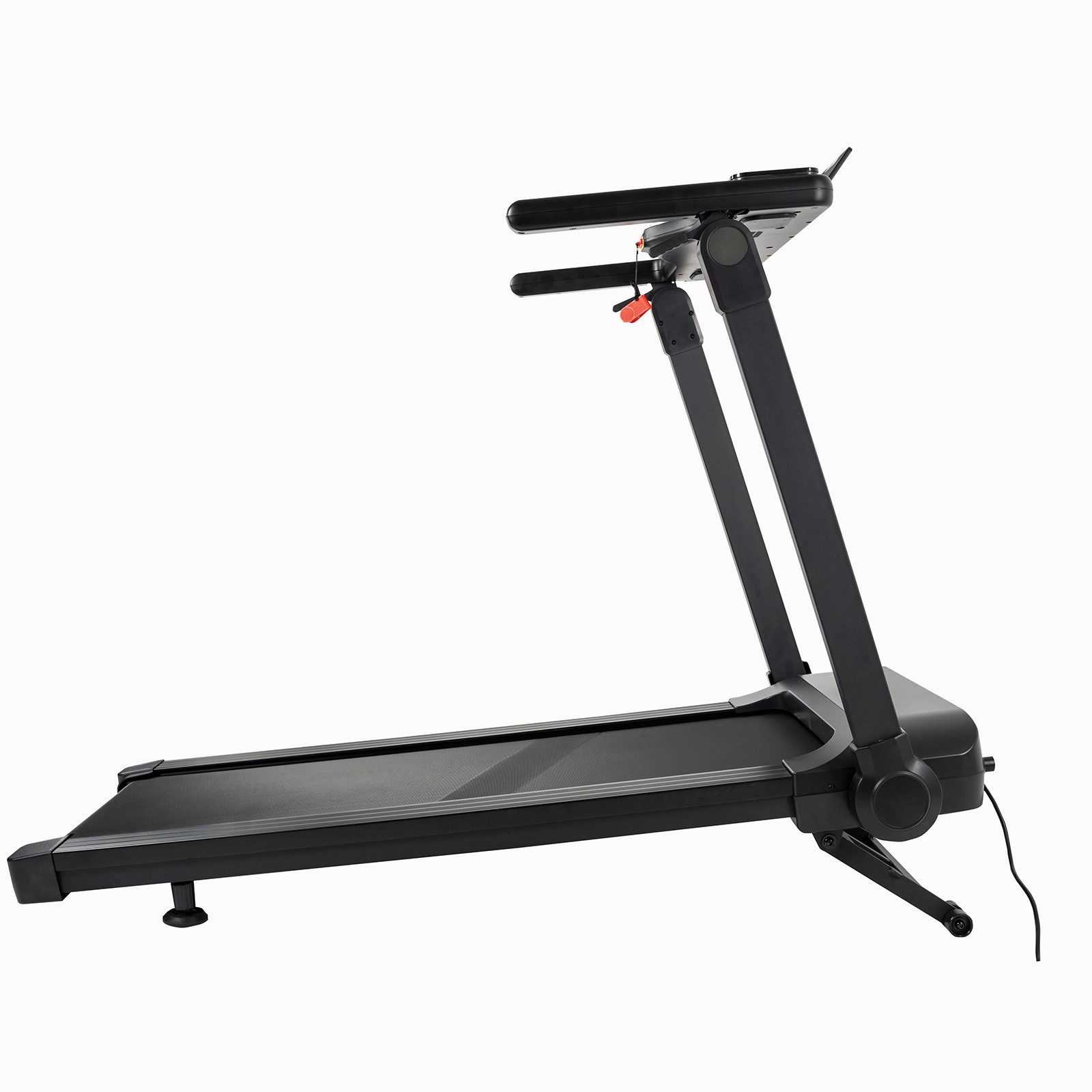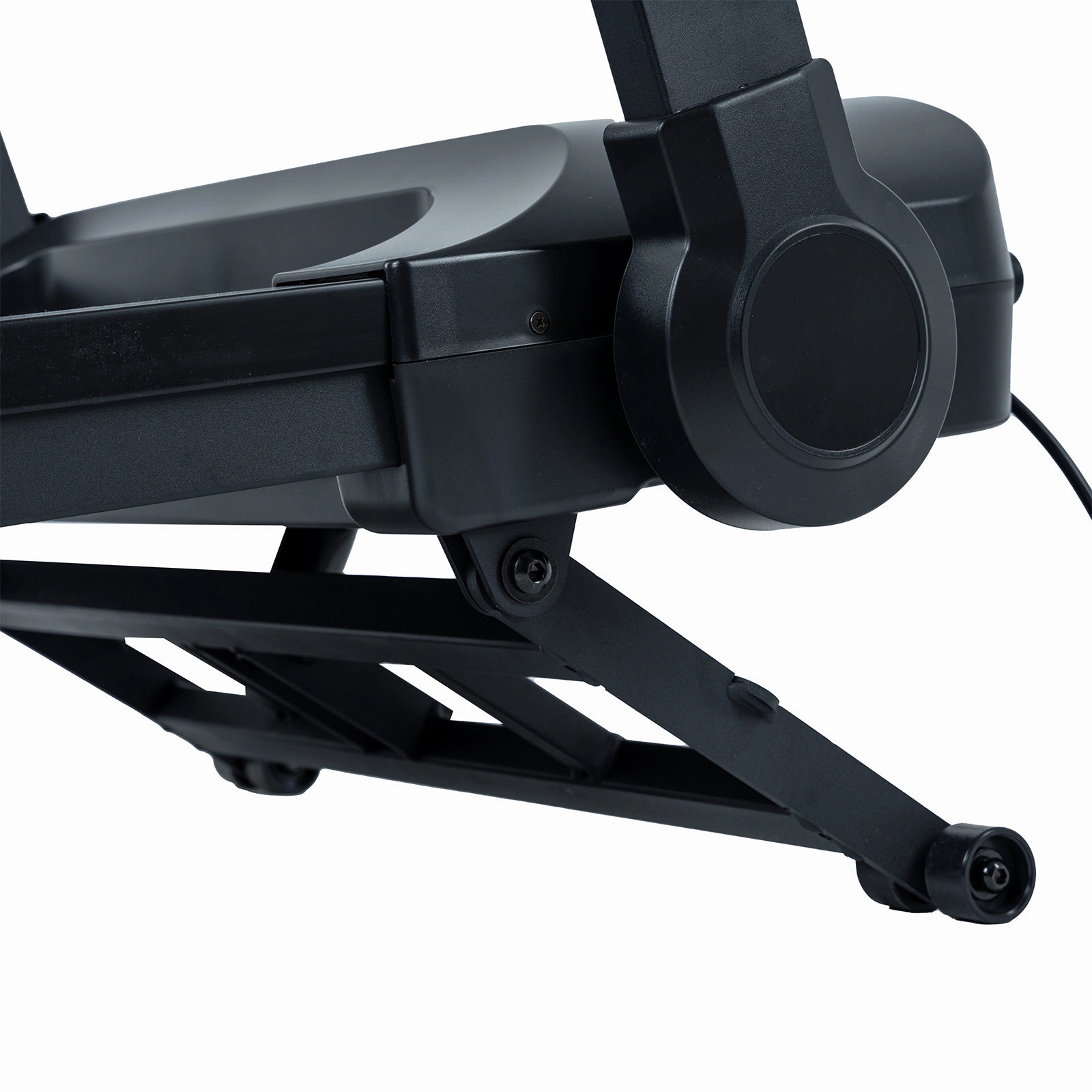 Bieżnia elektryczna TRACK 200 ma funkcję składania na płasko, dzięki której po skończonym treningu łatwo zmniejszysz zajmowaną przestrzeń. Złożenie bieżni zajmuje zaledwie kilka sekund. Blokadę umożliwiającą złożenie ramion bieżni zwalnia się za pomocą dźwigni umieszczonych pod poręczami. Dodatkowo kółka transportowe pozwolą na przesunięcie urządzenia w wybrane miejsce.Po złożeniu, jej wysokość wynosi ok. 22 cm dzięki czemu bieżnia łatwo zmieści się nawet pod łóżko. Bieżnię można przechowywać także w pionie co ułatwia przechowywanie, pamiętaj jednak aby zabezpieczyć urządzenie, ustaw bieżnie przy ścianie lub opartą o mebel unikając obsunięcia.