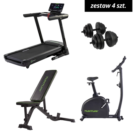 Kompletny Zestaw Treningowy Tunturi: bieżnia, rower, ławka i hantle.